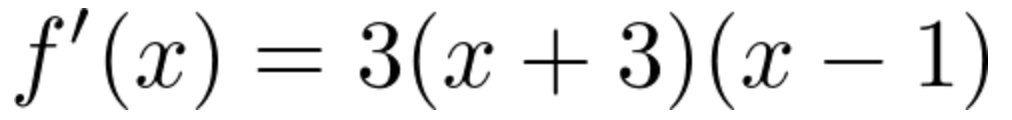 Het doel van deze stap is om onze afgeleide zo eenvoudig mogelijk te maken, maar factorisatie is niet altijd mogelijk. Vergeet niet te ontbinden in factoren waar je kan, want dat helpt je later enorm. Je bent misschien bekend met factorisatie uit onze vorige artikelen over het oplossen van vergelijkingen! Als je naar de afgeleide hierboven kijkt, zou je moeten zien dat elke term een factor drie in zich heeft. Met dit in gedachten, gaan we onze uitdrukking vereenvoudigen: